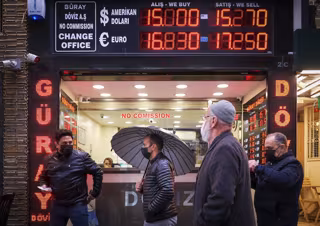 17 December 2021, Turkey, Istanbul: People walk in front of a currency exchange shop in Istanbul. The Turkish central bank cut its benchmark interest rate to 14 per cent on Thursday, the fourth consecutive cut since September, leading the lira to fall t - Serkan Senturk/ZUMA Press Wire/d / DPA