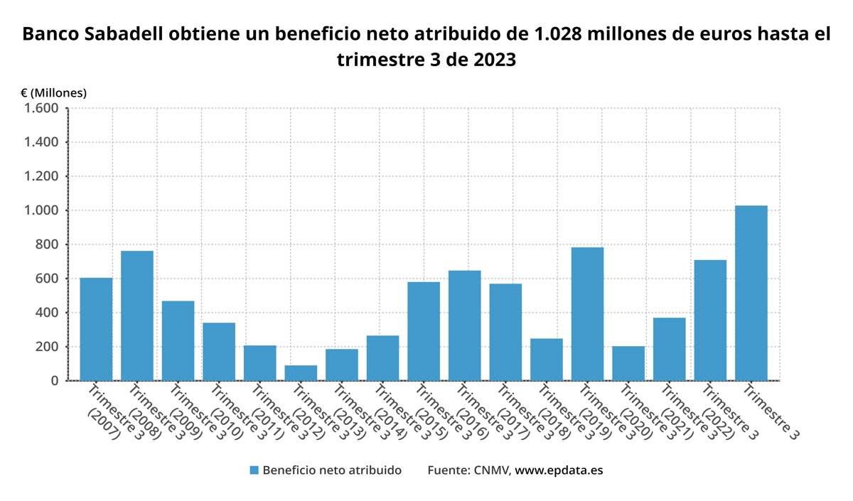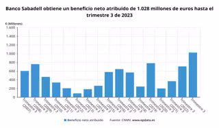 Banco Sabadell ha obtenido un beneficio neto atribuido de 1.028 millones de euros, un 44,9% más con respecto al mismo periodo del año anterior, y alcanza así el mejor resultado de su historia, según la información que ha remitido este jueves a la Comisión Nacional del Mercado de Valores (CNMV).
