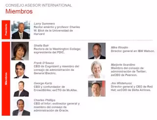 El consejo asesor internacional estará formado por el presidente y otros siete miembros: Sheila Bair (rectora de la Washington College), Frank D'Souza (consejero delegado de Cognizant y miembro del consejo de General Electric), George Kurtz (cofundador de CrowdStrike), Charles Phillips (exdirector general y miembro del consejo de Oracle), Mike Rhodin (director general en IBM Watson), Marjorie Scardino (miembro del consejo de Twitter) y Jim Whitehurst (director general y consejero delegado de Red Hat).