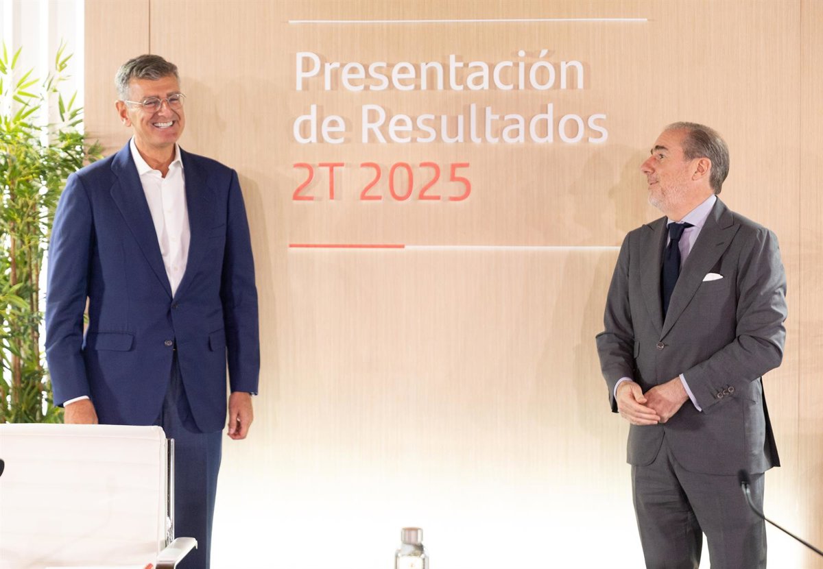 El consejero delegado, Héctor Grisi (d), y el director financiero, José García Cantera (i), durante una ruedas de prensa, en la Ciudad del Grupo Santander, a 30 de julio de 2025, en Boadilla del Monte, Madrid (España). Banco Santander obtuvo un beneficio - Eduardo Parra - Europa Press