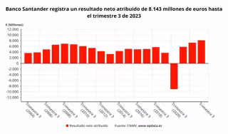 Santander obtuvo un beneficio atribuido récord de 8.143 millones de euros en los nueve primeros meses de 2023, un 11% más en euros corrientes (un 13% más en euros constantes) con respecto al mismo periodo del año anterior gracias al fuerte crecimiento de los ingresos, especialmente en Europa y México, que permitió neutralizar el aumento de las provisiones, según la información remitida este miércoles a la Comisión Nacional del Mercado de Valores (CNMV).