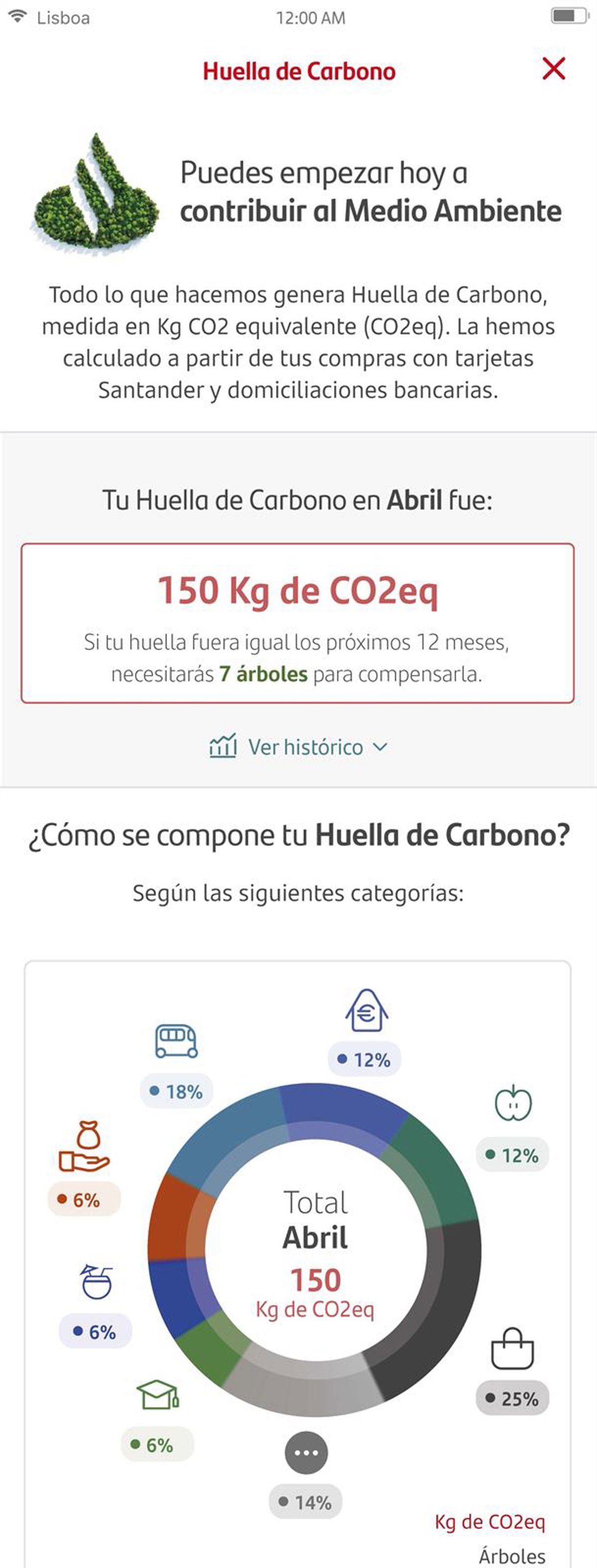 Banco Santander ha estrenado una nueva funcionalidad en su aplicación móvil y en su página web que permite a los clientes particulares en España medir su propia huella de carbono a partir de las compras realizadas con las tarjetas de la entidad y los recibos que tengan domiciliados, según ha informado a través de un comunicado.