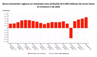 Santander obtuvo un beneficio atribuido de 9.309 millones de euros en los nueve primeros meses de 2024, un 14% más con respecto al mismo periodo del año anterior, gracias al "fuerte" crecimiento de los ingresos en todos sus negocios globales y regiones, según ha informado este martes a la Comisión Nacional del Mercado de Valores (CNMV).