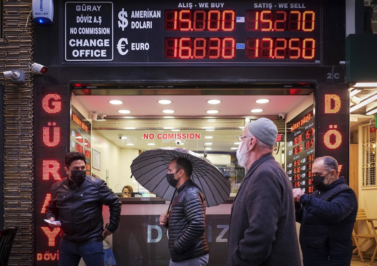 Archivo - 17 December 2021, Turkey, Istanbul: People walk in front of a currency exchange shop in Istanbul. The Turkish central bank cut its benchmark interest rate to 14 per cent on Thursday, the fourth consecutive cut since September, leading the lira t - Serkan Senturk/ZUMA Press Wire/d / DPA - Archivo