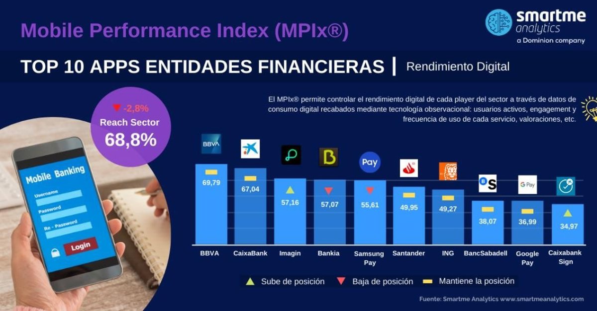 La consultora española Smartme Analytics ha indicado que el índice demuestra el éxito del nuevo grupo CaixaBank-Bankia que, al igual que en el trimestre anterior, coloca tres aplicaciones (CaixaBank, Bankia e Imagin) en el 'top 5' y cuatro en el 'top 10', con CaixaBank Sign.