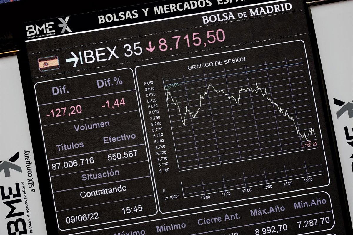 Un panel del Ibex 35, en el Palacio de la Bolsa, a 9 de junio de 2022, en Madrid (España). - Eduardo Parra - Europa Press