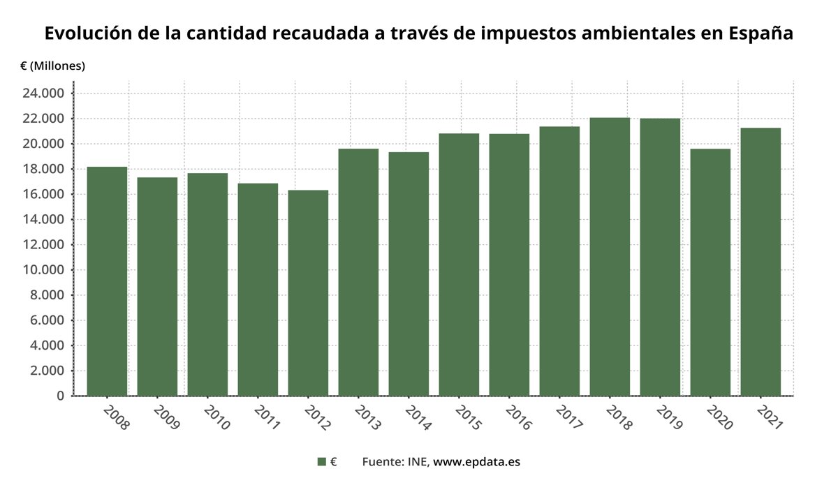 España recaudó un total de 21.265 millones de euros por impuestos ambientales en 2021, lo que supone un aumento del 8,5% respecto al año anterior, según datos publicados este jueves por el Instituto Nacional de Estadística (INE).