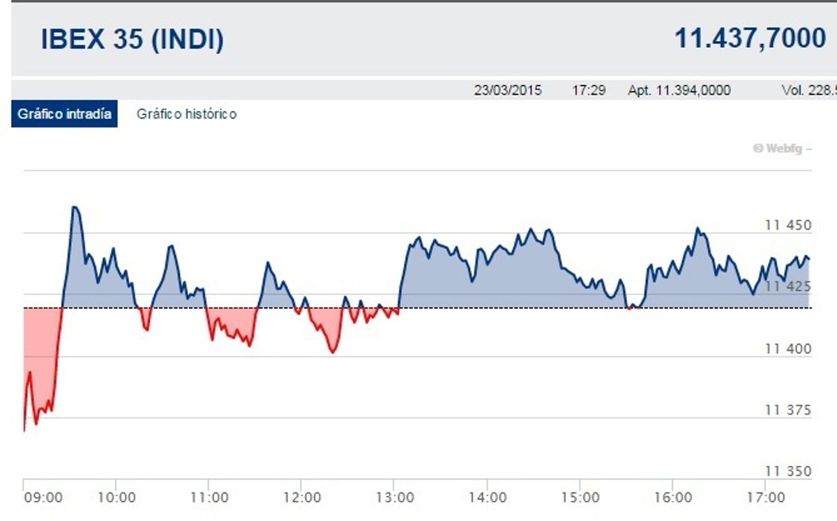 El Ibex 35 ha cerrado la sesión de este lunes con un repunte del 0,29%, lo que ha permitido al selectivo ampliar sus máximos de cinco años hasta los 11.452,8. En el mercado de deuda, la prima de riesgo se colocaba en 103,1 puntos básicos, con la rentabilidad del bono a diez años en el 1,25%.