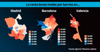 De su lado, en Barcelona los barrios con más renta son Vallvidrera-Tibidabo i Les Planes, Muntaner, Pedralbes-Sarriá, Sant Gervasi-La Bonanova, Diagonal-Provença, Passeig de Gràcia-Rambla de Catalunya y Sant Gervasi, mientras que los que tienen menos renta son Vallbona-Ciutat Meridiana-Torre Baro-Canyelles, Ciutat Vella-El Raval, La Guineueta-Verdún, La Prosperitat-Porta, La Verneda i La Pau y Pueblo Seco.