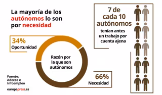 Dos de cada tres autónomos (66%) tienen un empleo por cuenta propia por necesidad, según se desprende del Informe sobre autónomos y/o freelances realizado por Adecco e Infoempleo.
