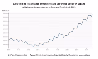 En paralelo, Seguridad Social ha subrayado que la tasa de temporalidad de los trabajadores extranjeros ha caído a mínimos históricos, al bajar hasta el 11,4% el porcentaje de afiliados extranjeros con contrato temporal, también por debajo del de los nacionales (11,6%). Ese porcentaje contrasta con el promedio del periodo 2017-2021 (41,1% del total).