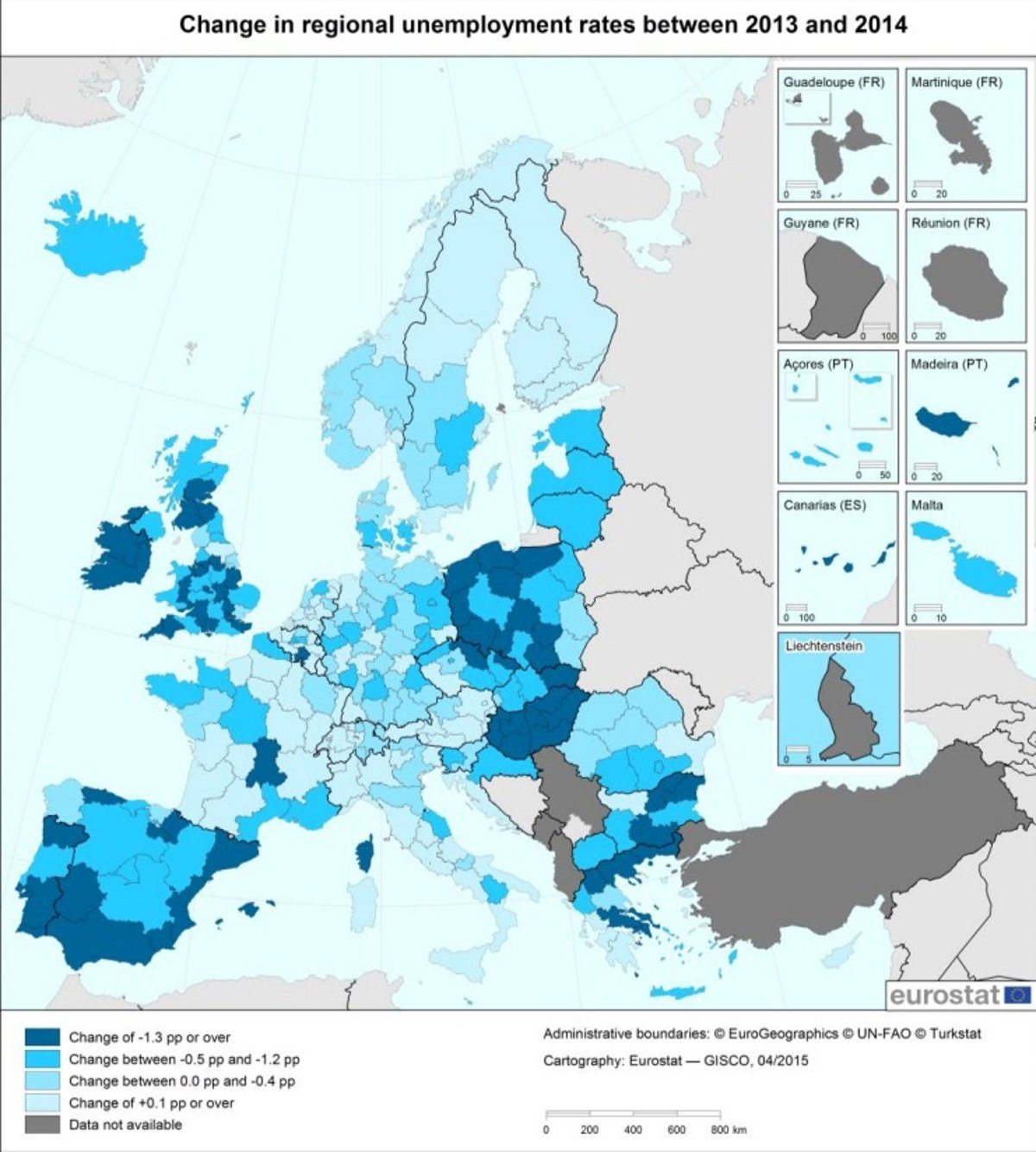 Un total de 13 regiones españolas registraban el doble de paro que el 10,1% de la media de la UE en 2014, incluyendo Galicia (21,7%), Asturias (21,1%), Aragón (20,2%), Castilla y León (20,8%), Castilla-La Mancha (29%), Andalucía (34,8%), Canarias (32,4%), Ceuta (31,9%), Extremadura (29,8%), Melilla (28,4%), Valencia (25,8%) y Murcia (26,6%).