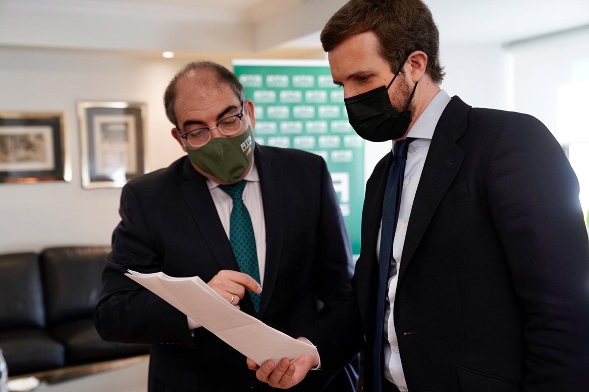 El líder del PP, Pablo Casado, ha trasladado este martes al presidente de ATA, Lorenzo Amor, las propuestas de su partido para ayudar a los autónomos, como eximir cotizaciones e impuestos a los autónomos que cierren su negocio en el estado de alarma. A su entender, "no hay excusa" por parte del Gobierno para no apoyar estas medidas.