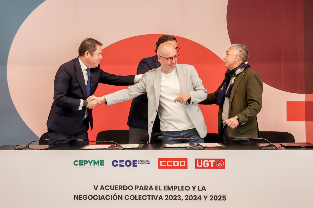 Los secretarios generales de CCOO y UGT, Unai Sordo y Pepe Álvarez, y los presidentes de CEOE y Cepyme, Antonio Garamendi y Gerardo Cuerva, respectivamente, han suscrito este miércoles el V Acuerdo para el Empleo y la Negociación Colectiva (AENC) que recomienda una subida salarial de al menos el 10% entre 2023 y 2025.
