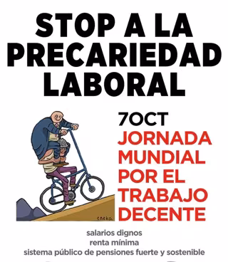 CC.OO. y UGT denunciarán, bajo el lema 'Stop a la precariedad laboral', la mala calidad de los empleos y los salarios "que han traído consigo las políticas del Gobierno" en el décimo aniversario de la Jornada Mundial por el Trabajo Decente, que se celebrará el próximo 7 de octubre.