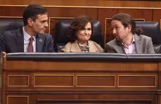 El presidente del Gobierno, Pedro Sánchez, y sus vicepresidentes Carmen Calvo y Pablo Iglesias, en sus escaños en el Congreso - Eduardo Parra - Europa Press