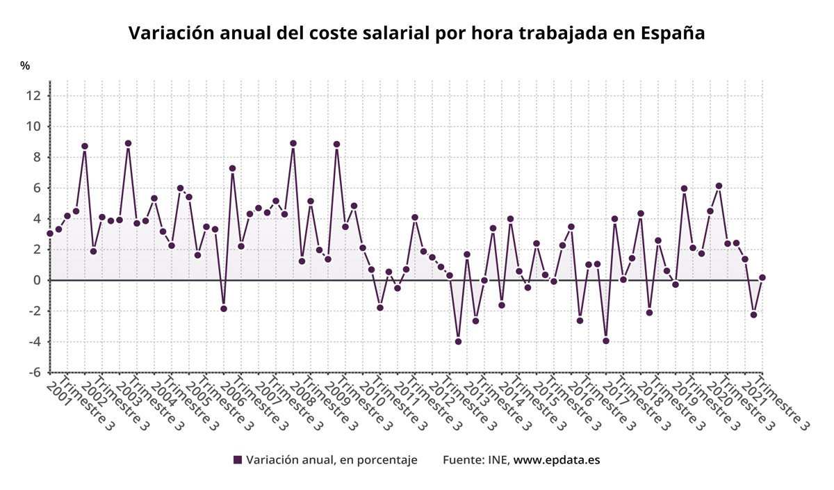 El coste por hora trabajada aumentó un 0,2% en el tercer trimestre respecto al mismo periodo de 2020 tras el desplome que sufrió en el segundo trimestre (-3,7%), según los datos provisionales del Índice de Coste Laboral Armonizado (ICLA) publicados este viernes por el Instituto Nacional de Estadística (INE).
