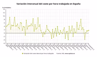 Variación interanual del coste laboral por hora trabajada en España (INE) - EPDATA