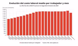 El coste laboral medio por trabajador y mes (que incluye las remuneraciones y las cotizaciones sociales) se desplomó un 8,3% en el segundo trimestre del año, hasta los 2.442,91 euros, registrando así su mayor descenso en 20 años, según ha informado este jueves el Instituto Nacional de Estadística (INE).