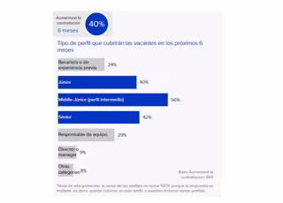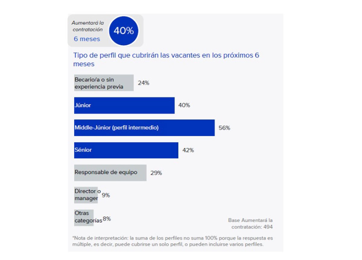 Entre las empresas que prevén contratar en los próximos seis meses, se aprecia que la capacidad de gestión y la experiencia previa de los perfiles intermedios son muy valoradas, ya que estos concentran la mayor intención de incorporación. De hecho, el 56% ha afirmado que cubrirá posiciones de este nivel.
