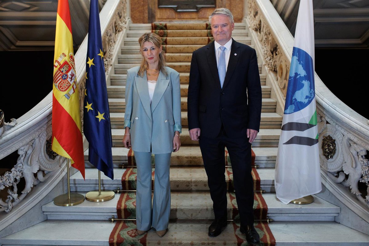 La vicepresidenta segunda y ministra de Trabajo, Yolanda Díaz, y el secretario general de la Organización para la Cooperación y el Desarrollo Económicos (OCDE), Mathias Cormann, inauguran el Foro Global Deal, en la Casa de América, en Madrid. - Alejandro Martínez Vélez - Europa Press