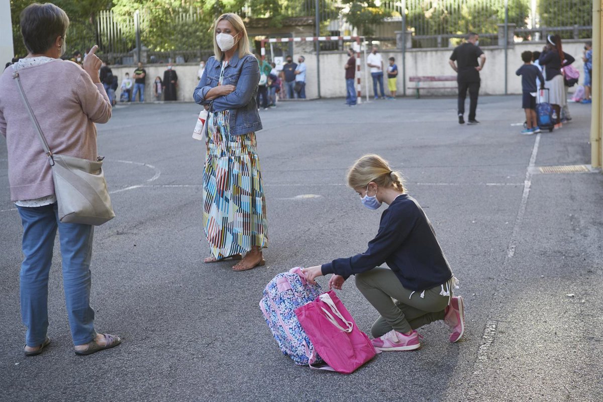 Una niña con su familia en el Colegio Público Víctor Pradera da la bienvenida a los alumnos en el primer día de colegio del curso escolar 2020-2021en Pamplona, Navarra (España), a 4 de septiembre de 2020. Desde que finalizase el pasado curso por la COVI - Eduardo Sanz - Europa Press - Archivo