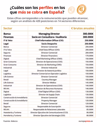Entre los perfiles mejor pagados, con remuneraciones que oscilan entre los 250.000 y los 200.000 euros, también destacan los directores de información, dentro del sector de tecnologías de la información (IT) y telcomunicaciones; los socios de despachos en el sector legal, los directores de datos y también los directores comerciales tanto del sector bancario como asegurador.