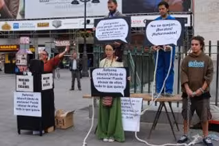 Varios miembros de la Confederación General del Trabajo (CGT), Ecologistas en Acción y la red contra la exclusión social Baladre han representado hoy una 'performance' teatral en la Puerta del Sol de Madrid para denunciar la "venta de esclavos" que provoca la reforma laboral.
