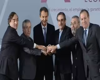 Aunque el acuerdo fue alcanzado en la madrugada del lunes al martes, fue presentado con un logo propio estampado en el cartel. Delante, estaban sentados los máximos responsables de los agentes sociales, quienes se han negado a dar al acuerdo aires de pacto de Estado y mucho menos a compararlos con los Pactos de la Moncloa.