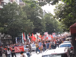 En la marcha también participan el portavoz de los socialistas vascos, José Antonio Pastor, y el coordinador de Ezker Anitza-IU, Mikel Arana. Los participantes han coreado lemas como "Contra los recortes, huelga general", "Dónde están no se ven, los empleos del PP", "Manos arriba, esto es un atraco" y en contra de las privatización de servicios públicos y de la banca.