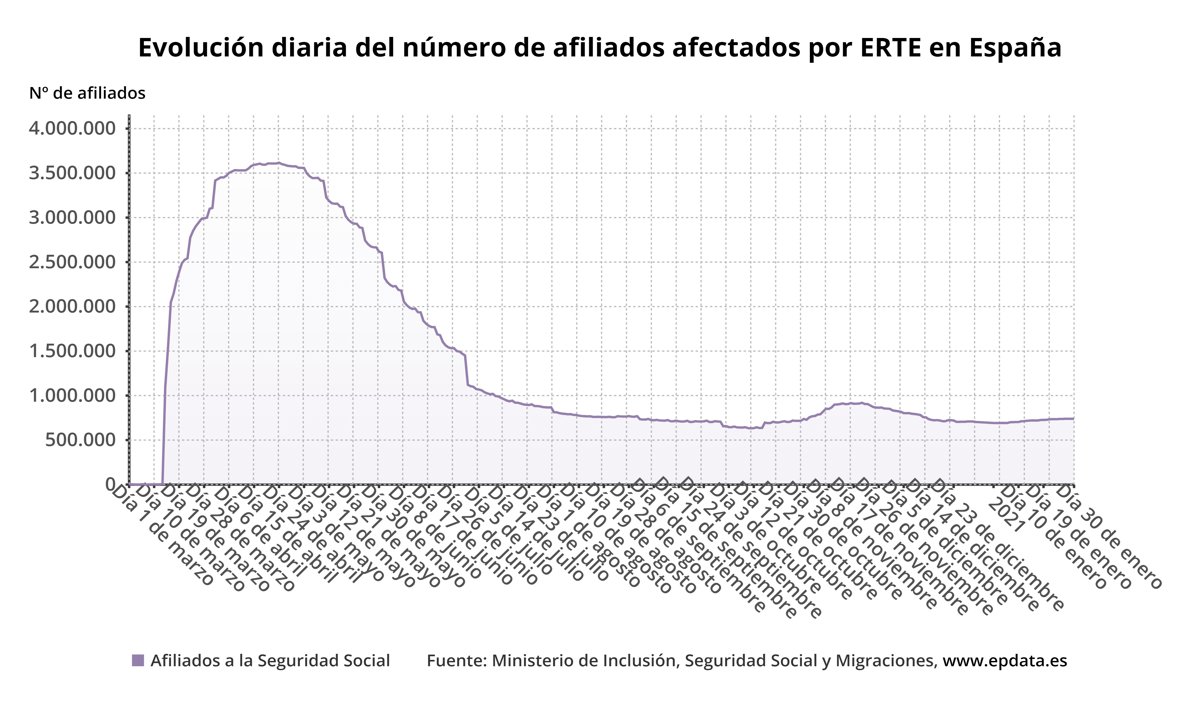El número de trabajadores en expedientes de regulación temporal de empleo (ERTE) cerró el mes de enero en 738.969 personas, lo que supone 35.625 trabajadores más que en diciembre, según ha informado este martes el Ministerio de Inclusión, Seguridad Social y Migraciones.