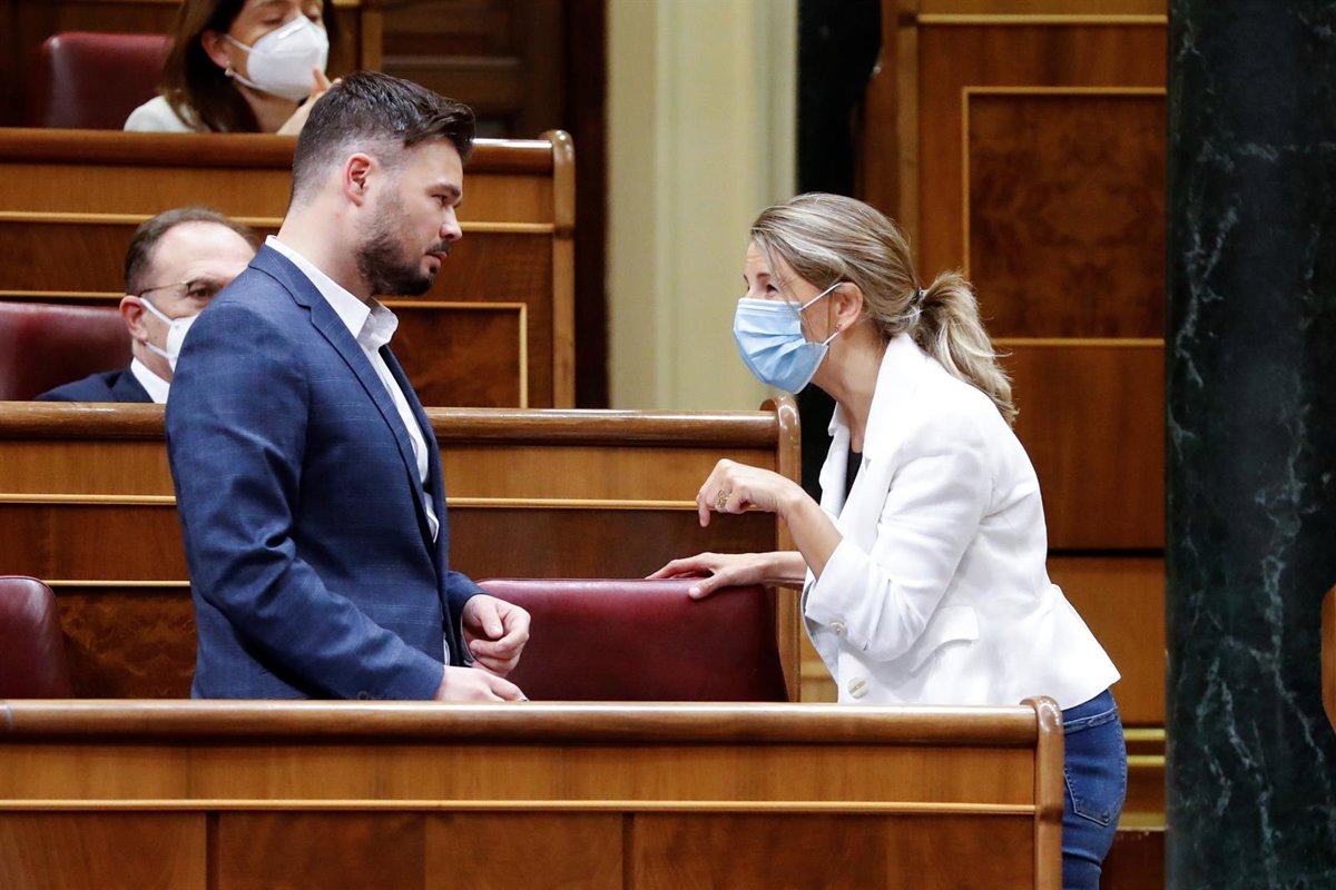 La ministra de Trabajo, Yolanda Díaz, conversa con el portavoz de ERC, Gabriel Rufián, durante un Pleno del Congreso - Pool - Archivo