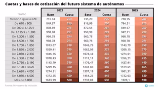 Mientras que en los tramos de rendimientos más bajos la cuota también decrece entre 2023 y 2025, a partir de los rendimientos netos superiores a 1.700 euros la cuota se va incrementando a lo largo de esos tres años.