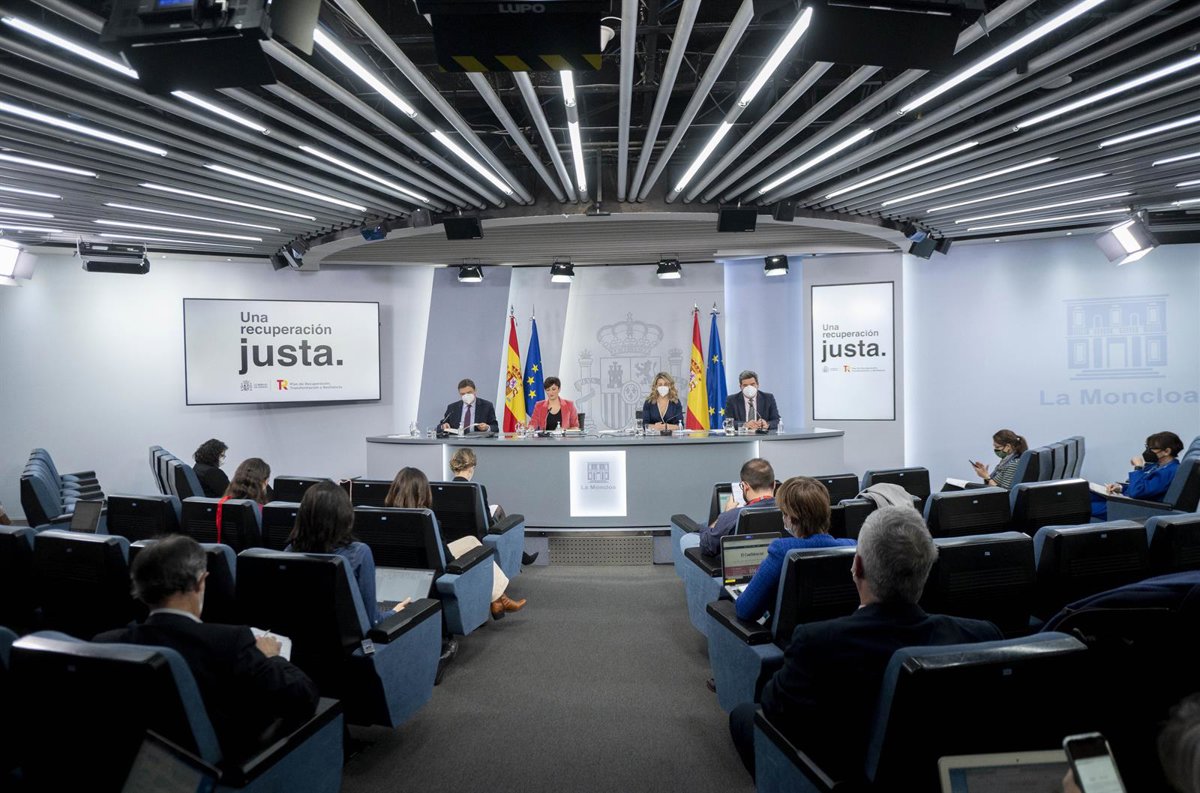 (I-D) El ministro de Agricultura, Pesca y Alimentación, Luis Planas; la ministra Portavoz, Isabel Rodríguez; la vicepresidenta segunda y ministra de Trabajo, Yolanda Díaz, y el ministro de Seguridad Social, José Luis Escrivá, a 28 de diciembre de 2021. - EUROPA PRESS/A.Ortega.POOL - Europa Press