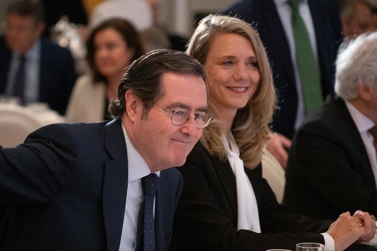 La presidenta de Cepyme, Ángela de Miguel, y el presidente de la CEOE, Antonio Garamendi, durante un desayuno informativo de Fórum Europa organizado por Nueva Economía Fórum, a 21 de abril de 2026, en Madrid (España). - Fernando Sánchez - Europa Press