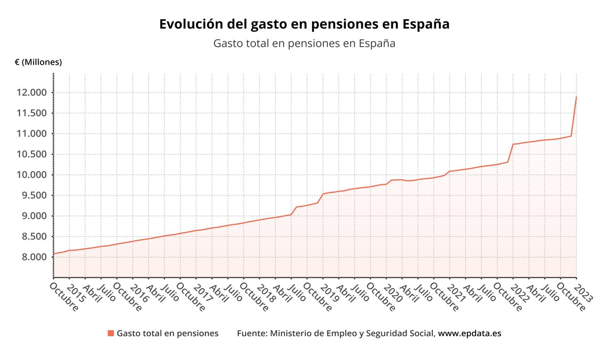 El gasto ha crecido en casi 1.000 millones de euros respecto a la nómina del pasado mes de diciembre y supera por primera vez en la historia los 11.000 millones de euros. Ello se debe a que, en aplicación de la reforma de pensiones, éstas han subido para 2023 un 8,5%, como resultado de la inflación media del periodo diciembre de 2021-noviembre de 2022.