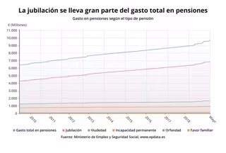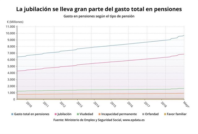 Del total de pensiones, más de la mitad, 6.014.303, fueron pensiones de jubilación, con un repunte del 1,8% respecto a mayo de 2018, mientras que 2.355.943 eran pensiones de viudedad (+0,00%), 955.782 de incapacidad permanente (+0,5%), 339.445 de orfandad (-0,02%), y 42.473 a favor de familiares (+2,1%).