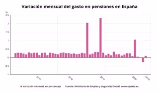 Por otro lado, el número de pensiones pertenecientes a clases pasivas alcanzó en mayo la cifra de 634.475, con un gasto mensual de 1.148,88 millones de euros.