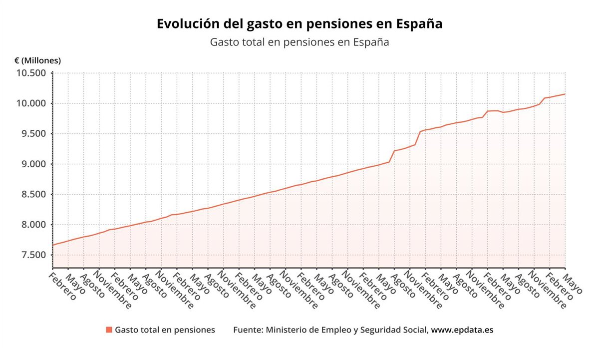 La Seguridad Social destinó en el presente mes de mayo la cifra récord de 10.154,1 millones de euros al pago de pensiones contributivas, un 3% más que en el mismo mes de 2020, según ha informado este martes el Ministerio de Inclusión, Seguridad Social y Migraciones.