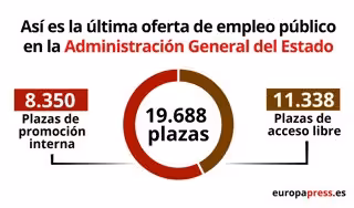 En total, se alcanzan las 19.688 plazas en esta nueva oferta, por encima del total de 15.108 plazas de ayer, si bien a esta oferta hay que sumarle las plazas que se convoquen para las Fuerzas y Cuerpos de Seguridad del Estado, militares, Sanidad y Enseñanza de Ceuta y Melilla, hospitales militares, Justicia no transferida (órganos centrales y algunas comunidades autónomas) y entes públicos empresariales, como Puertos del Estado, autoridades portuarias, Enaire, la Fábrica de la Moneda o Sasemar.
