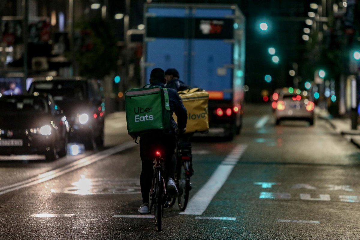 Un rider de Glovo y otro de Uber Eats circulan durante la primera noche de toque de queda en Madrid (España), a 26 de octubre de 2020. El Gobierno central anunció ayer la aprobación del estado de alarma para toda España, que entró en vigor ayer mismo y - Ricardo Rubio - Europa Press - Archivo