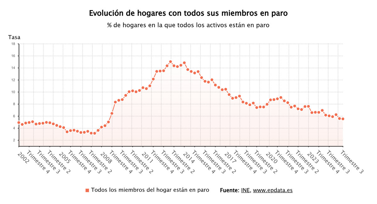 Entre julio y septiembre, los hogares con todos sus miembros ocupados disminuyeron en 34.400 (-0,28%), hasta un total de 12.037.700 hogares. En los últimos doce meses, las familias con todos sus miembros ocupados se han incrementado en 239.700 (+2%).