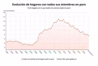 Los hogares con todos sus miembros en paro disminuyeron en 96.600 en el segundo trimestre, un 8,8% menos respecto al trimestre anterior, hasta situarse en 992.800, bajando del millón por primera vez en diez años y medio, según datos de la Encuesta de Población Activa (EPA) difundida este jueves por el Instituto Nacional de Estadística (INE).