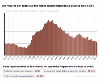 Por último, los hogares en los que no hay ningún activo cayeron en 18.500 entre abril y junio (-0,34%), hasta los 5,4 millones. En el último año, estos hogares se han incrementado en 103.600 personas (+1,94%).