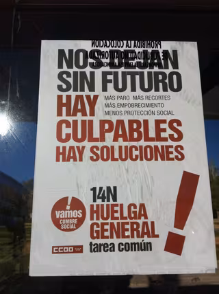 El lema de esta huelga, 'Nos dejan sin futuro. Hay culpables, hay soluciones', presidirá la cabecera de la manifestación con una pancarta de 14 metros que, además de llevar el lema impreso en español, también tendrá parte en inglés y alemán, acentuando así el carácter internacional de esta huelga, enmarcada en una jornada de lucha en toda Europa.