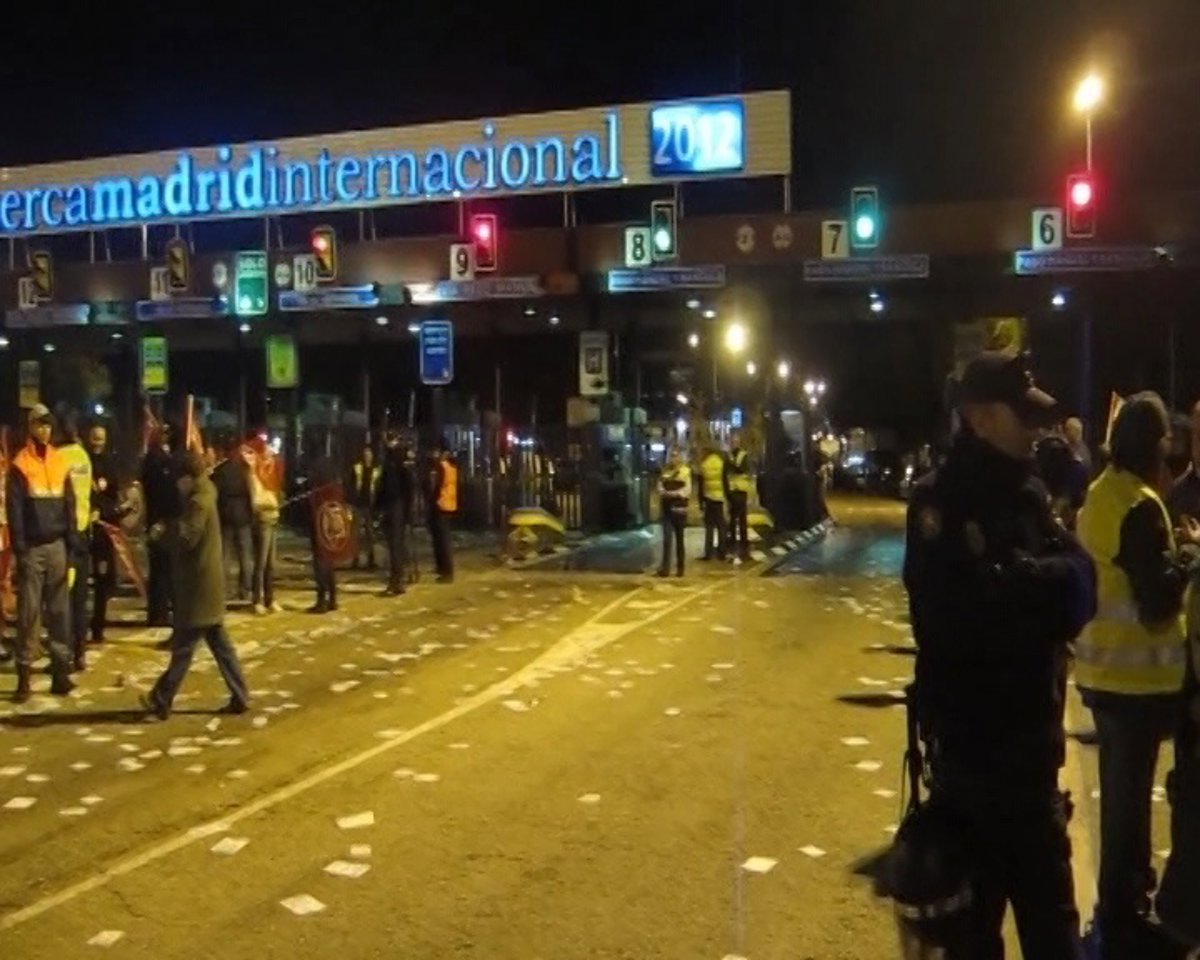 Una comitiva de seis u ocho coches abandona los garajes de UGT rumbo a Mercamadrid. Si bien, antes pararán en distintas gasolineras para prevenir a los trabajadores de las mismas de que no se están respetando los servicios mínimos fijados, a la vez que les invitan a cerrar el local a fin de que secunden la huelga general "por el bien de todos los trabajadores".
