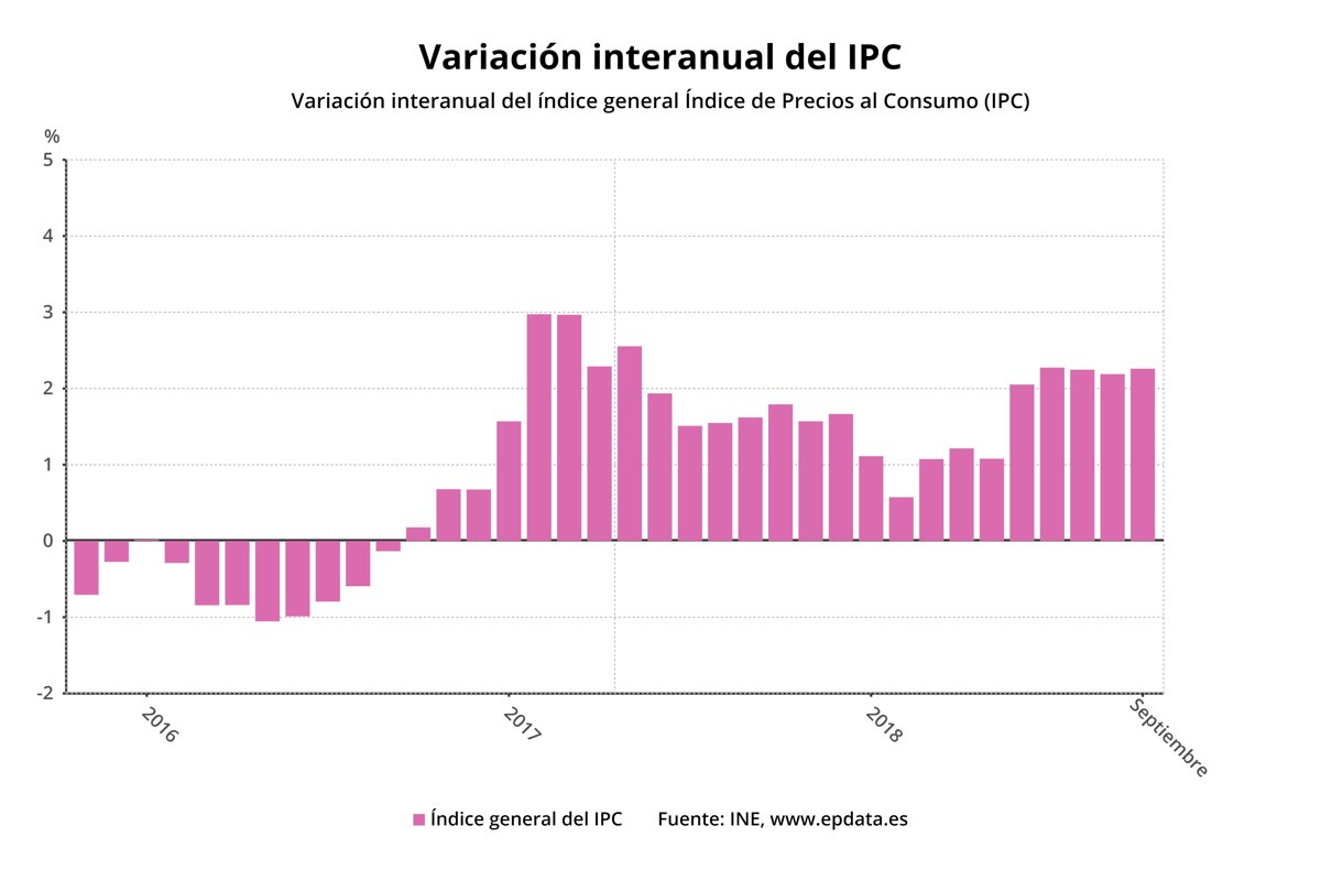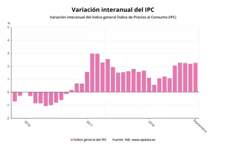 MADRID, 11 Oct. (EUROPA PRESS) - El Índice de Precios de Consumo (IPC) aumentó un 0,2% en septiembre en relación al mes anterior y elevó su tasa interanual hasta el 2,3%, una décima más de lo avanzado a finales del mes pasado, según los datos definitivos publicados este jueves por el Instituto Nacional de Estadística (INE). En el repunte de la tasa interanual del IPC de septiembre ha influido principalmente la subida de los precios de la electricidad y, en menor medida, del gasóleo para calefacción y del gas. En sentido contrario, bajaron los precios de los alimentos, especialmente de las frutas y las legumbres, mientras que los precios de los carburantes subieron en septiembre menos que en igual mes de 2017. La tasa interanual de septiembre es la vigésimo quinta tasa positiva que encadena el IPC interanual e implica que los precios son hoy un 2,3% superiores a los de hace un año. La tasa de IPC interanual llevaba dos meses estable en el 2,2%, pero en septiembre ha vuelto a registrar el mismo dato que en junio, lo que sitúa a los precios en máximos desde abril de 2017. La inflación subyacente, que no incluye los precios de los productos energéticos ni de los alimentos no elaborados, se mantuvo en el 0,8% en septiembre, con lo que se coloca 1,5 puntos por debajo del IPC general. En el noveno mes del año, el Índice de Precios de Consumo Armonizado (IPCA) situó su tasa anual en el 2,3%, una décima por encima de la registrada en agosto. Según el INE, entre los grupos que tuvieron una mayor influencia positiva en el aumento de la tasa interanual se encuentran la vivienda, que subió un punto su tasa anual, hasta el 5,3%, debido a la subida de los precios de la electricidad, frente a la estabilidad registrada el pasado año. También influyó, aunque en menor medida, el aumento de los precios del gasóleo para calefacción, mayor este mes que en 2017, y del gas, cuyos precios bajaron en septiembre del año anterior. A la vivienda se sumaron además los hoteles, cafés y restaurantes, con una variación del 1,9%, una décima mayor que la de agosto, debido, en su mayor parte, a que los precios de los servicios de alojamiento disminuyen este mes menos de lo que lo hicieron en septiembre de 2017. Por contra, los grupos que tuvieron una mayor repercusión negativa en la tasa anual de septiembre fueron los alimentos y bebidas no alcohólicas, cuya tasa anual descendió tres décimas, hasta el 1,7%, y el transporte, con una variación del 5%, dos décimas por debajo de la del mes anterior. En términos mensuales, el IPC aumentó un 0,2% en relación a agosto, debido principalmente al incremento de los precios del vestido y calzado en un 5,3%, que refleja el comportamiento de los precios tras la finalización de las rebajas y el inicio de la temporada de invierno y al alza de los precios en la vivienda y el transporte en un 1,1% y en un 0,4%, respectivamente. Por rúbricas, las que más elevaron sus precios en tasa mensual fueron las prendas de vestir de hombre (+8,7%), los complementos y reperaciones de prendas de vestir (+8,1%) y el calzado de niño (+6,7%). Por el contrario, los mayores descensos mensuales se registraron en el transporte público interurbano (-4,1%), las frutas frescas (-2,4%) y el turismo y hostelería (-2,1%). En tasa interanual, las rúbricas que experimentan los mayores descensos de precios son los aceites y grasas (-7%), el transporte público interurbano (-5,1%) y el azúcar (-2,9%). En el lado opuesto, los mayores ascensos de precios en el último año los experimentan las frutas frescas (+11,9%), patatas y sus preparados (+10,5%) y huevos (+6%). En tasa mensual, los precios subieron en septiembre en todas las comunidades autónomas salvo en Asturias (-0,1%), Baleares (-0,1%) y Cantabria (-0,2%), mientras que en Murcia y La Rioja se mantuvieron sin cambios. En términos interanuales, el conjunto de las 17 comunidades presentó tasas positivas en septiembre. La tasa más elevada correspondió a Castilla-La Mancha (+2,7%) y la má baja a Baleares (+1,9%).