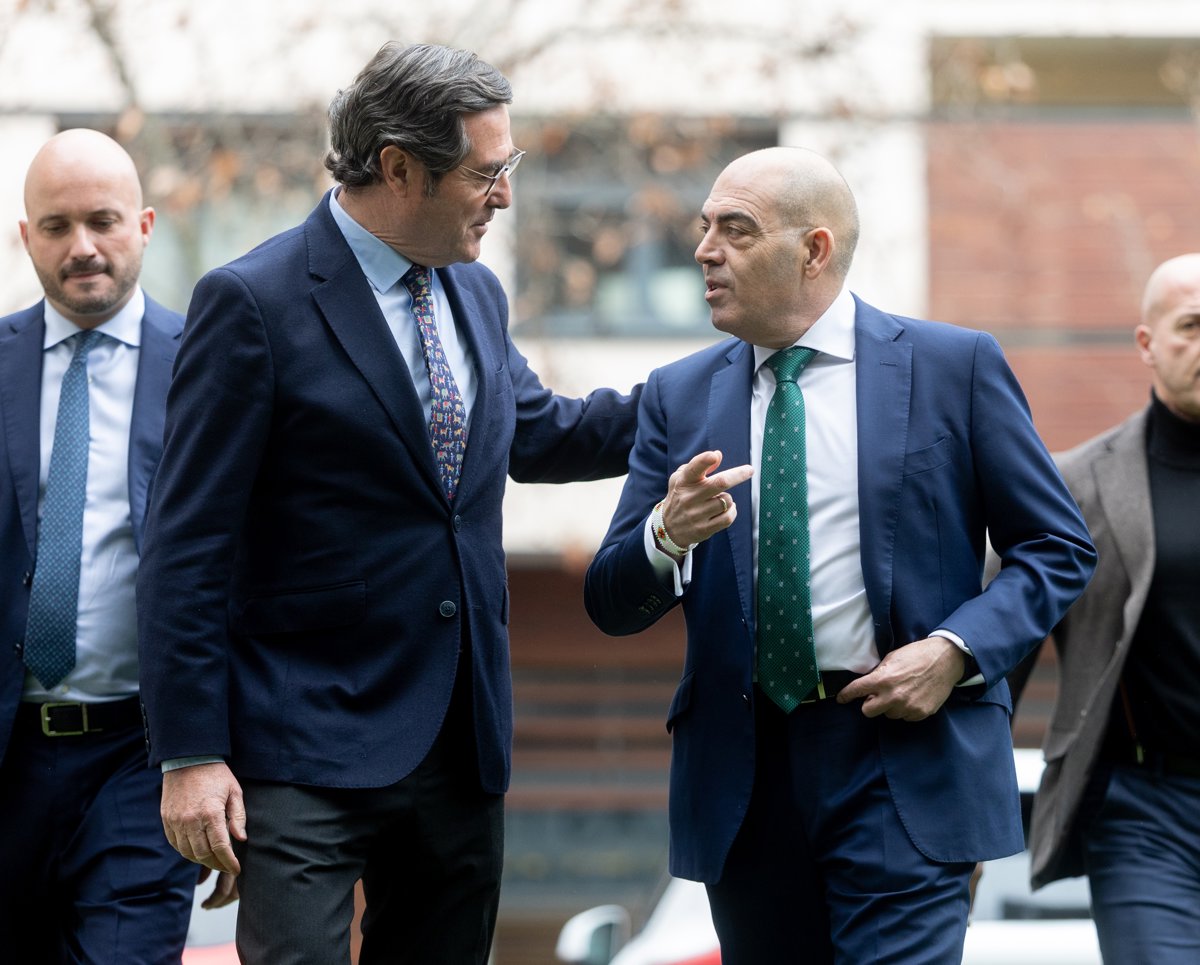 (I-D) El presidente de la CEOE, Antonio Garamendi, y el presidente de ATA, Lorenzo Amor, a su llegada a la asamblea electoral de la Federación Nacional de Asociaciones de Trabajadores Autónomos (ATA), en el Hotel Meliá Castilla, a 3 de marzo de 2025, en - Eduardo Parra - Europa Press
