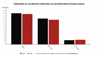 De acuerdo con los datos provisionales del Ministerio, los accidentes mortales en jornada de trabajo bajaron un 4,5% hasta abril tras registrarse 193 fallecidos, nueve menos que en 2024, mientras que los siniestros 'in itínere' con resultado de muerte aumentaron un 7,5%, hasta un total de 43 fallecidos, tres más que en el primer cuatrimestre del año pasado.