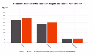 De acuerdo con los datos provisionales del Ministerio, los accidentes mortales en jornada de trabajo subieron un 7,9% en los seis primeros meses del año, al registrarse 299 fallecidos, 22 más que en igual periodo de 2023, mientras que los siniestros 'in itínere' con resultado de muerte aumentaron un 1,7%, hasta un total de 61 fallecidos, frente a los 60 del mismo periodo del año pasado.